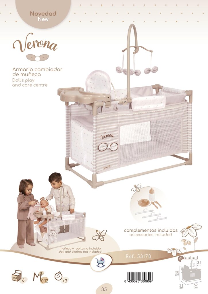 DeCuevas 53178 Moje první postýlka pro panenky s hracím centrem Verona 2025 patří do stejnojmenné, velmi úspěšné kolekce z roku 2025, která nabízí nejen zmíněné kočárky, ale i jiné doplňky pro malé slečny a jejich panenky.