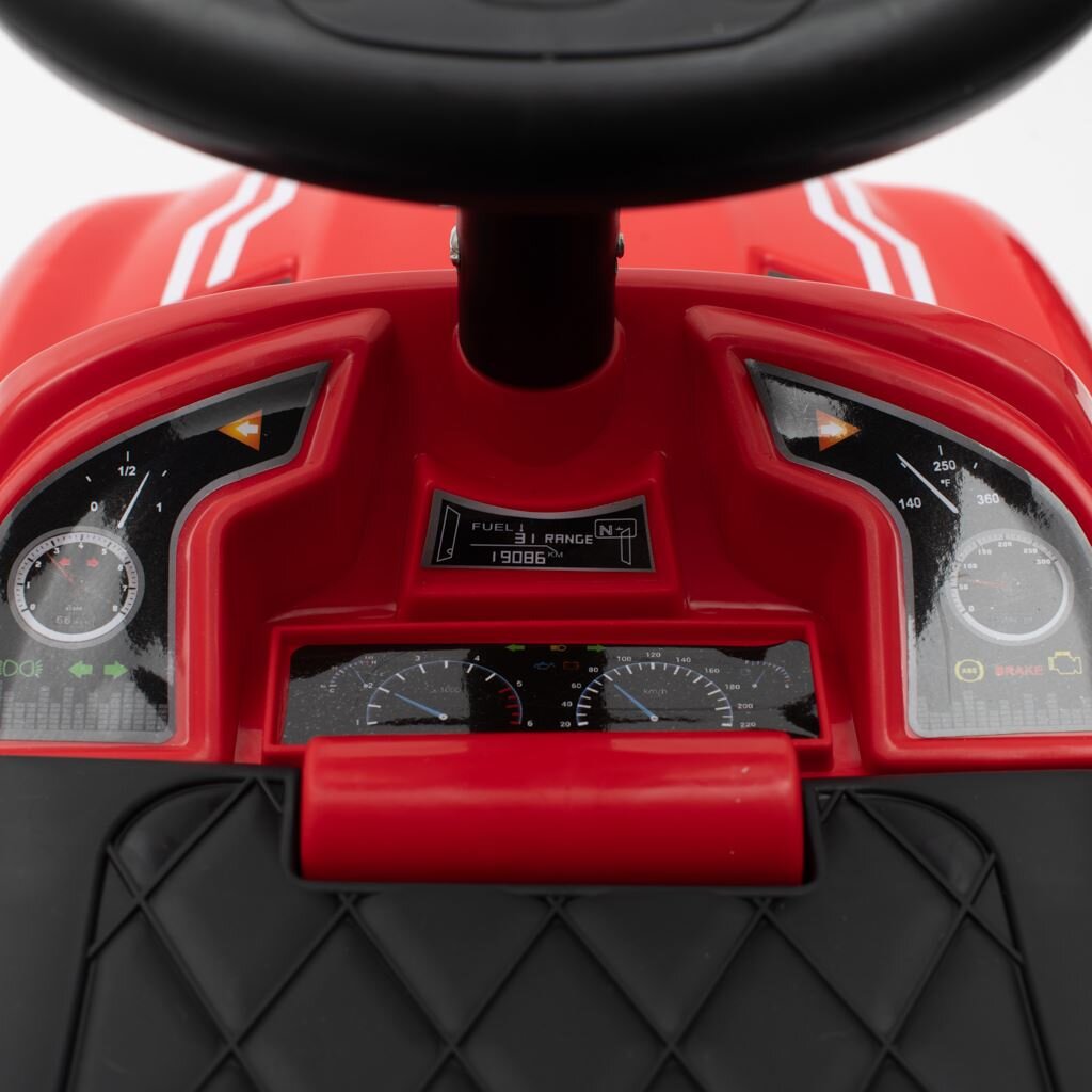 Dokonalé zpracování a detaily jako kola, světla nebo tvar karoserie, přitahují pozornost všech a rychle se stanou oblíbenou hračkou doma i na procházce. Je vyrobeno z kvalitních materiálů a je vybaveno zvukovým panelem. Jezdítko pomáhá rozvíjet motorické schopnosti dítěte a zaručuje spoustu zábavy a radosti. Díky speciální blokádě v zadní části je váš závodník chráněn proti převrácení. Vodící tyč, opěrky na ruce a podnožky lze sundat, a tím dítě využije autíčko jako klasické odrážedlo.