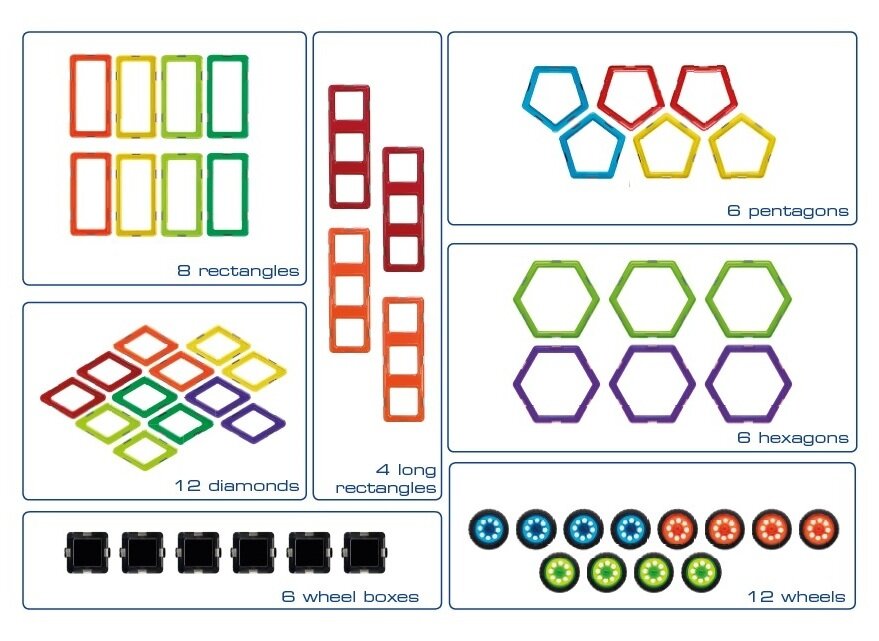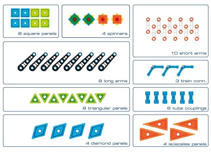 Výjimečná sada obsahující 205 dílků mnoha barev a tvarů, vč. spinnerů, koleček a podvozků na sestavení nejrůznějších staveb a dopravních prostředků.