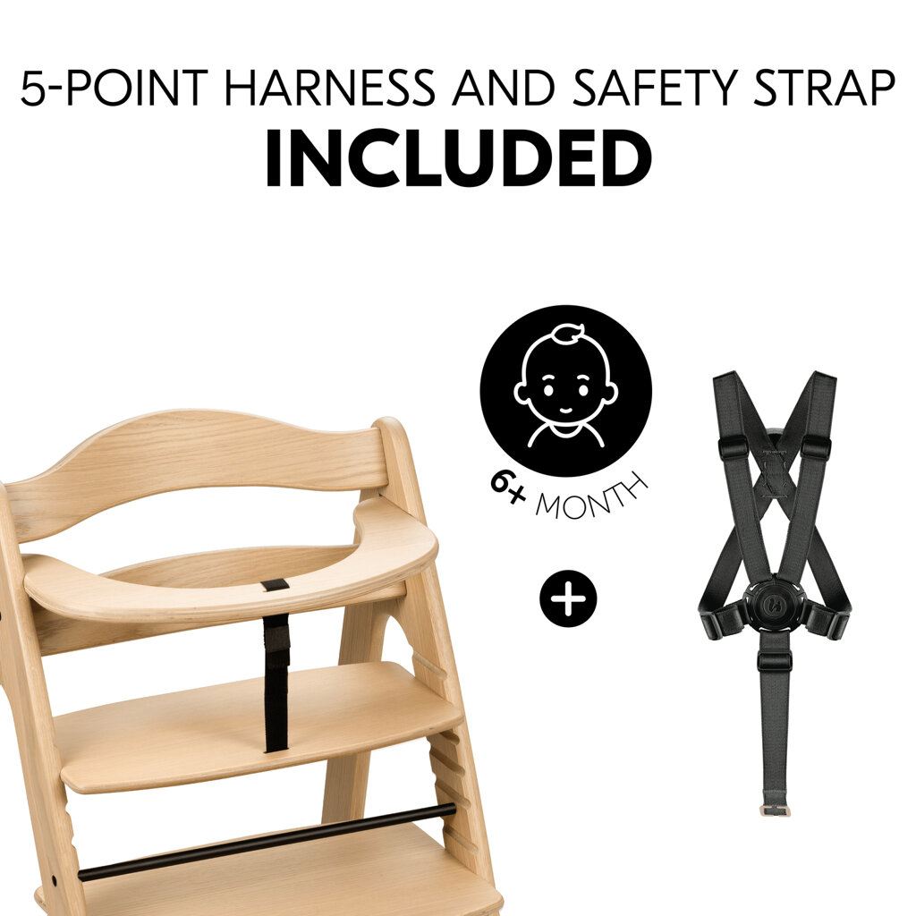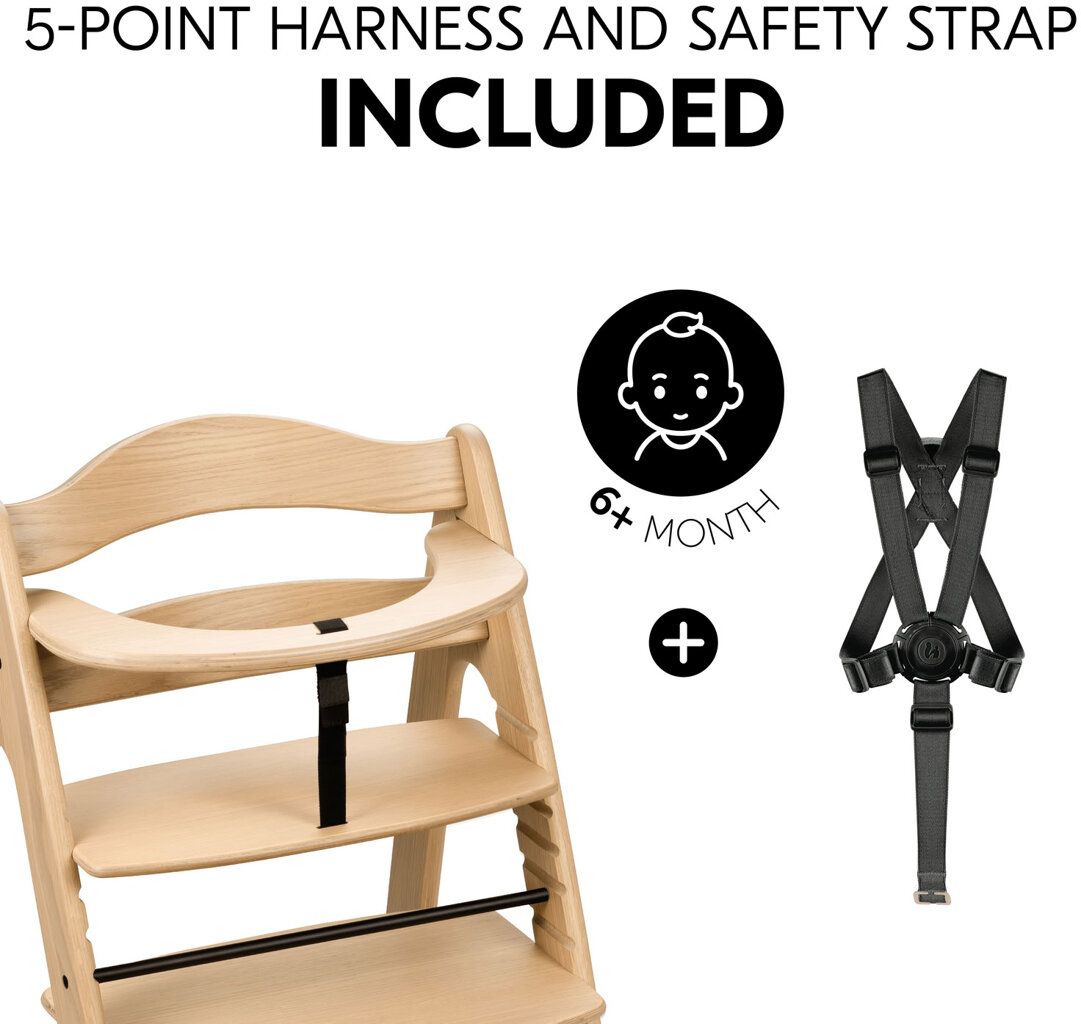 Jídelní židlička - materiál dřevo, vhodná pro děti od 6 měsíců, s nosností do 130 kg, zabezpečení dítěte zajišťuje 5bodový pás, možnost nastavení výšky židle, židlička má odnímatelný tác.