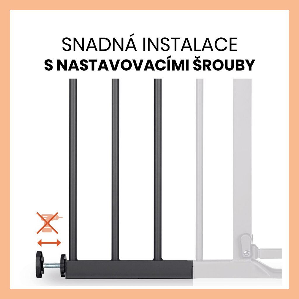 PRODLOUŽENÍ se jednoduše připevní k zábraně pomocí dvou spojovacích prvků, poté se pomocí polohovacích šroubů z venkovní strany bezpečně upevní do rámu dveří / nebo proti zdi či schodišti.
