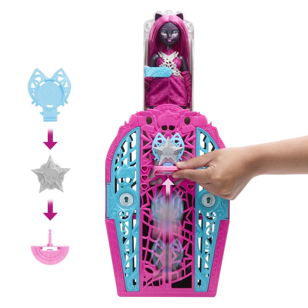 Vyřešte záhadu, otevřete brány Hauntlywoodu a odhalte kloubovou panenku Monster High. Děti se mohou stát strašidelnými detektivy a hledat stopy na mapě pomocí „kouzelného“ zvětšovacího klíče. Po cestě je čeká více než 19 úžasných překvapení, včetně třpytivých oblečků, děsivých rukavic a oslnivého šperku. Po skončení hraní si děti mohou uklidit monsterku, oblečení a doplňky do hvězdného šatníku, který je ideální nejen pro ukládání, ale i pro vyprávění příběhů.