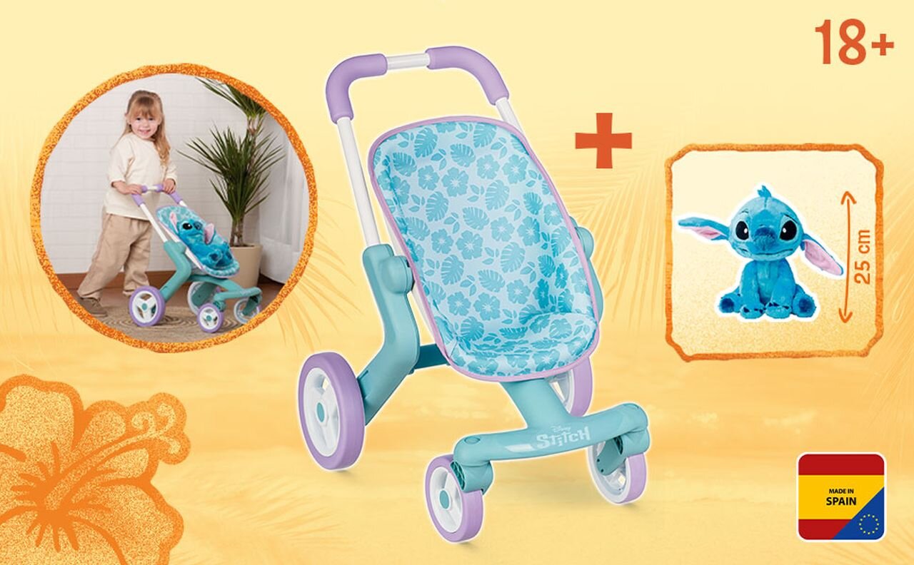 Ergonomická rukojeť, otočná přední kolečka pro snadné řízení. Kovové trubky a plastový rám jsou velmi lehké a tudíž snadno ovladatelné. Sedák z tkaniny. K čištění látky používejte pouze houbičku lehce navlhčenou vodou. Výška rukojeti 53 cm. Součástí kočárku je plyšák Stitch, výška 25 cm.