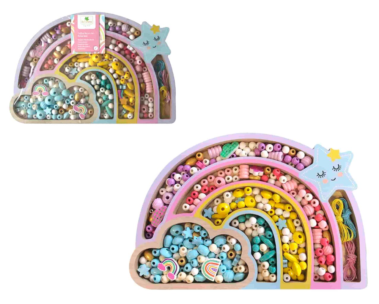 Dřevěné pastelové korálky uložené v krabičce ve tvaru duhy jsou krásný dárek pro děti od 4 let.