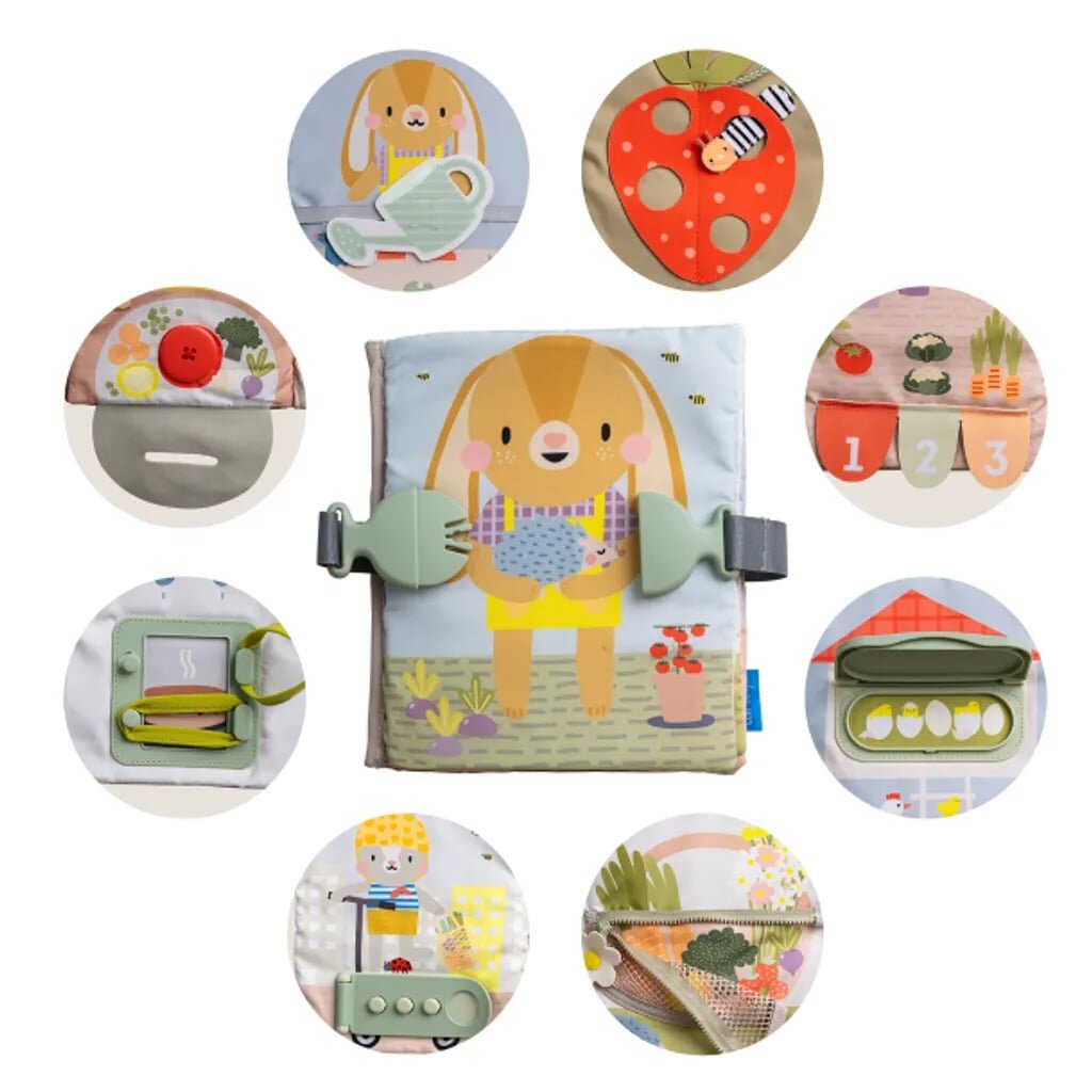 Textilní knížka My First Busy Book značky Taf Toys, s krásnými ilustracemi nabízí dvanáct různých aktivit včetně zipů, přezek, tkaniček, knoflíků apod.