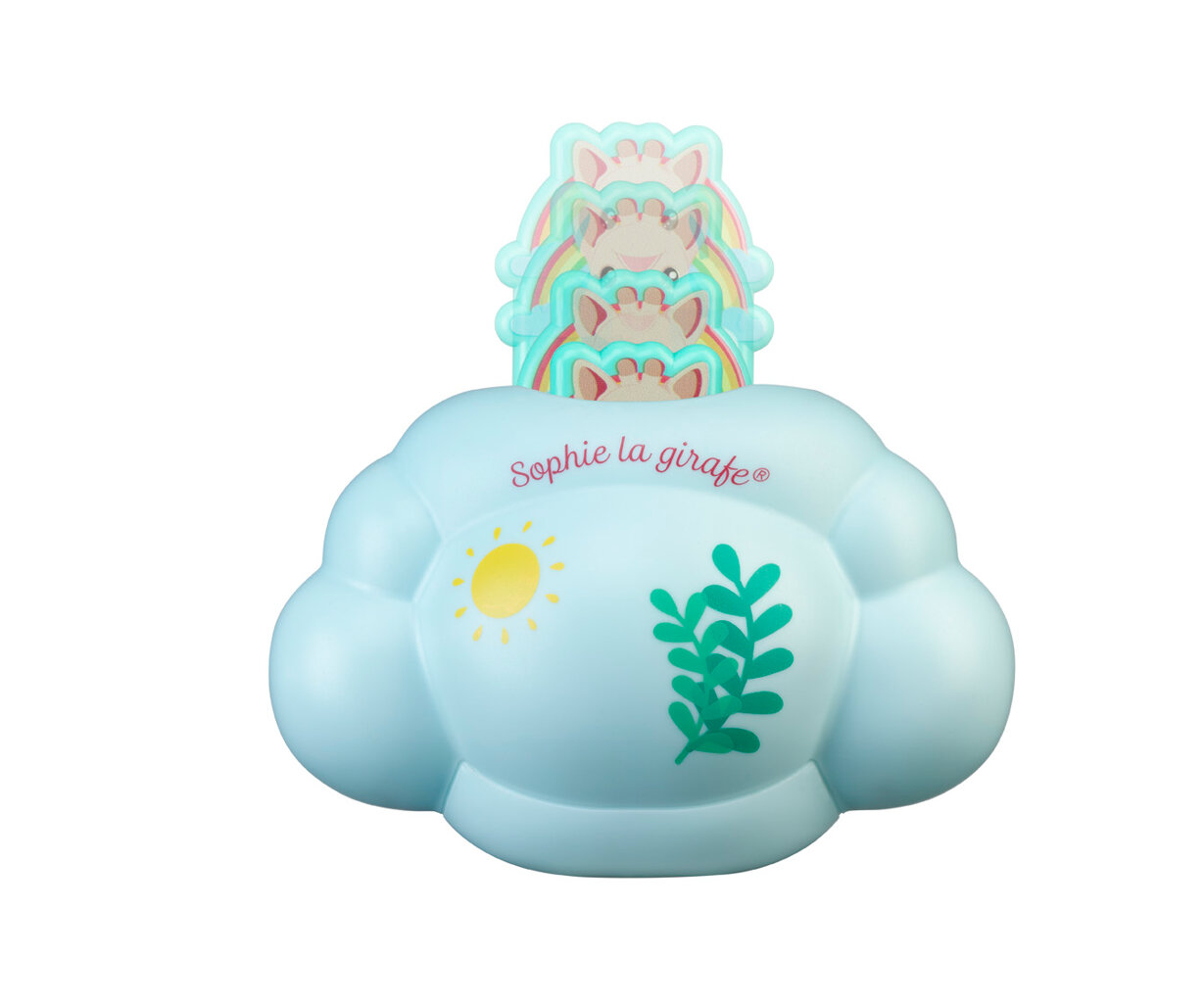 Tato hračka má dvě funkce: konvičku a hru na schovávanou. Když mráček ponoříte do vody, žirafa Sophie doslova vyskočí ze svého obláčku a jakoby kouzlem se objeví. Jakmile hračku vytáhnete z vody, začne z ní pršet voda jako z konvičky a žirafa Sophie se začne schovávat zpátky do svého obláčku. Dva různé motivy na přední a zadní straně hračky pro lepší představivost.