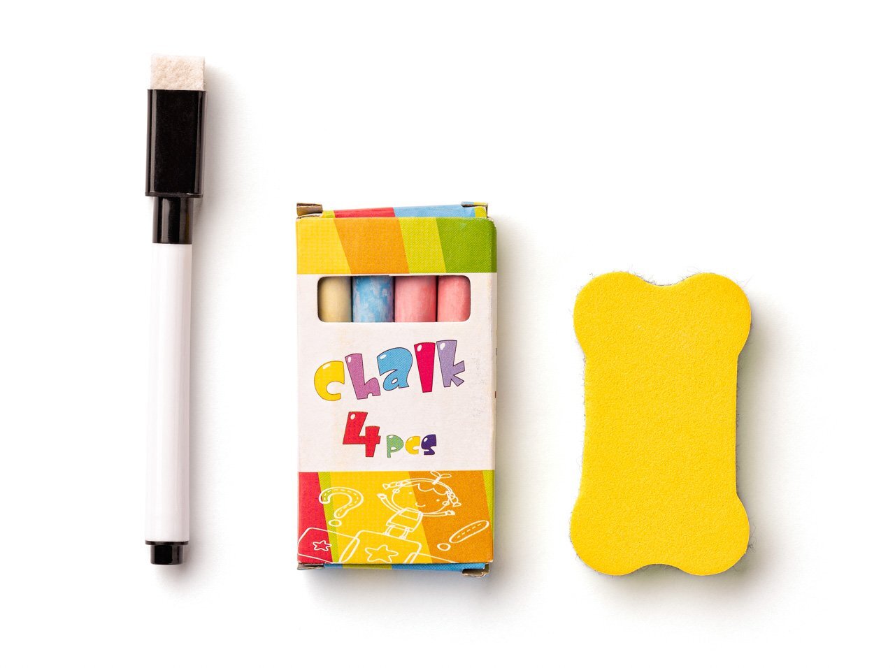 Z jedné strany černá plocha pro psaní křídami, z druhé bílá magnetická plocha pro psaní fixou. Obsahuje velké množství magnetických písmen, čísel i znaků pro nácvik skládání slov i jednoduchých matematických příkladů, dále pak barevné křídy, fix a houbičku.